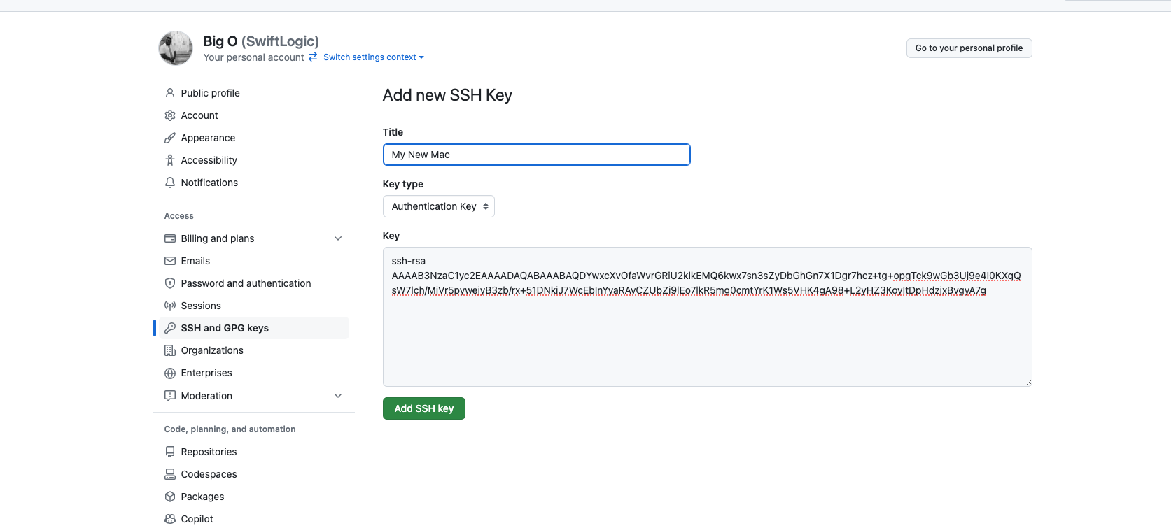 Our GitHub account will now recognize the new Mac as a trusted device for authentication. GitHub uses this SSH key to authenticate us when we interact with repositories via SSH.